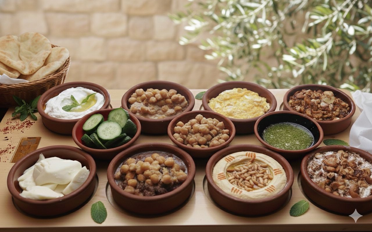 Sabah-el-Kheir-Menü mit Ei, Sucuk, Käse, Labneh, Magdus, Salami, Mrabe, Butter und Brot – طبلية ٢-٤ أشخاص
